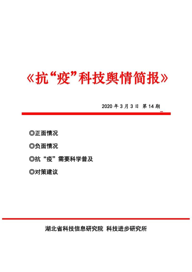 3月3日,湖北省科技信息研究院(以下简称“湖北信息院”)的《抗“疫”科技舆情简报》第14期出炉。为使湖北省委省政府高效了解防控资讯、准确掌握舆情动向、及时把握攻关进展、提前预判疫情趋势,并科学精准地做出疫情防控、科研攻关、舆情引导等决策部署,该院从疫情发生以来先后开发、编制了5个面向不同对象的内参专报,已累计刊发30余期次。